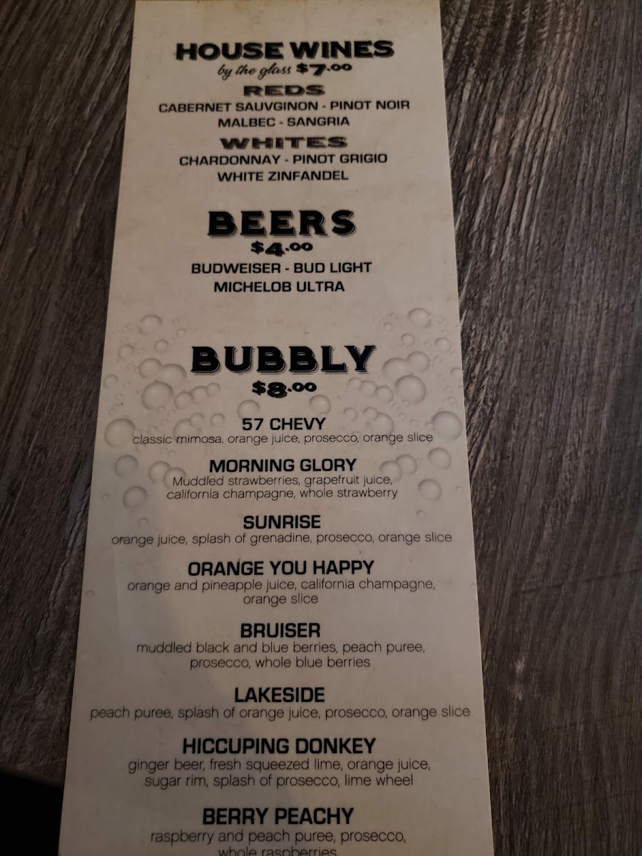 - Bubbly: A range of sparkling beverages including 57 Chevy, Morning Glory, Sunrise, Orange You Happy, Bruiser, Lakeside, Hiccuping Donkey, and Berry Peachy.